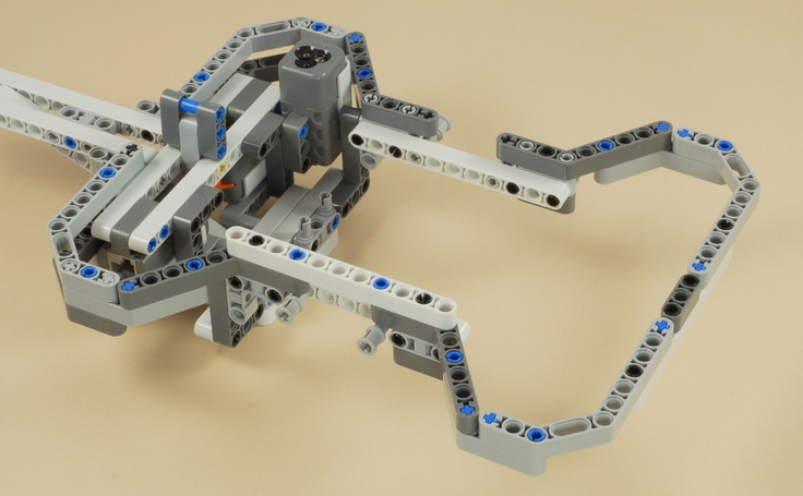 | 2. Rotate the NXT so that the wires are routed as shown, and plug it into the frame at the four attachment points as shown below. |