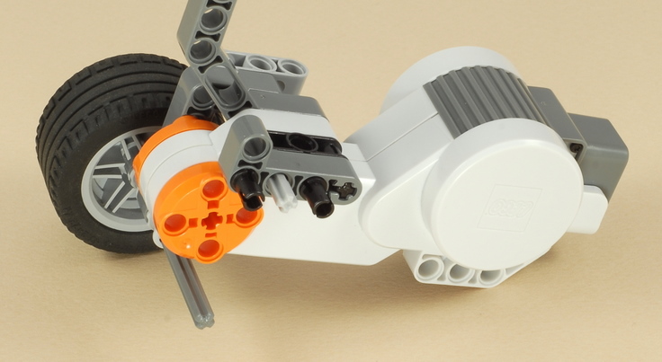 | Slide the axle through the right-angled beam on the motor assembly as shown below, then push on the second bushing. Make sure that the bushing is not too tight, so that the axle still turns freely. Finally, check to make sure that the axle stop is still pulled all the way into the hub of the wheel. |